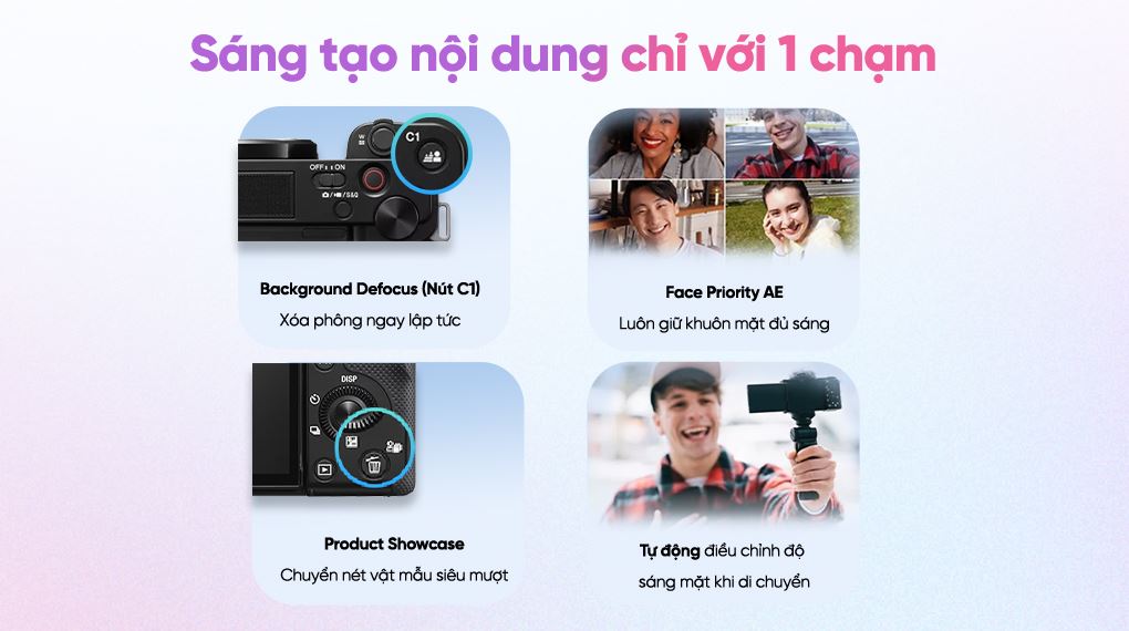 Tính năng Product Showcase là "cứu cánh" cho các buổi quay review sản phẩm, giúp máy chuyển nét từ gương mặt sang vật mẫu siêu mượt mà. Bên cạnh đó, Face Priority AE đảm bảo khuôn mặt của bạn luôn đủ sáng, tự động điều chỉnh phơi sáng thông minh khi bối cảnh thay đổi ánh sáng đột ngột.