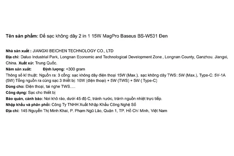 | Đầu ra | Type C: 5V - 1AKhông dây (điện thoại): Max 15WKhông dây (TWS): 5W |