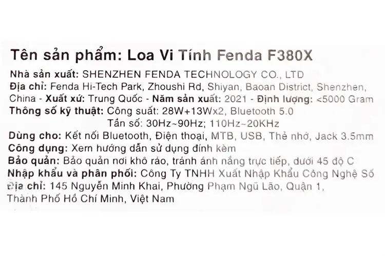 Thông số kỹ thuật Loa vi tính Bluetooth Fenda F380X