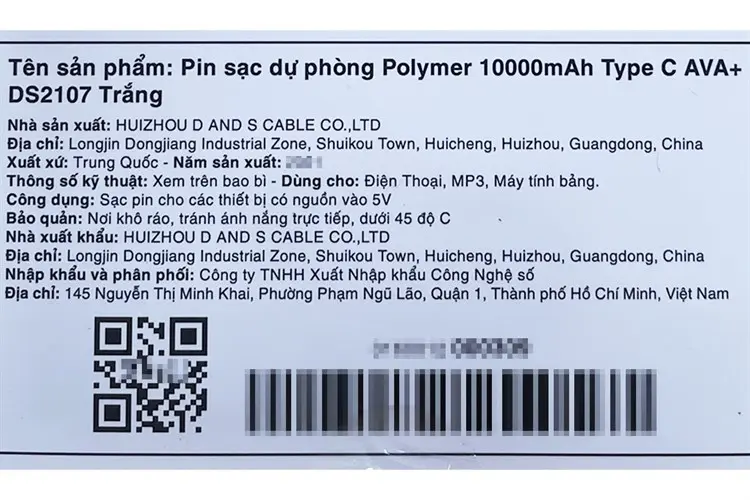 Thông số kỹ thuật Pin sạc dự phòng Polymer 10000mAh Type C 15W AVA+ DS2107