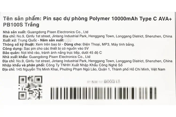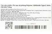 Thông số kỹ thuật Pin sạc dự phòng Polymer 10000mAh Type C 10W AVA+ PB100S