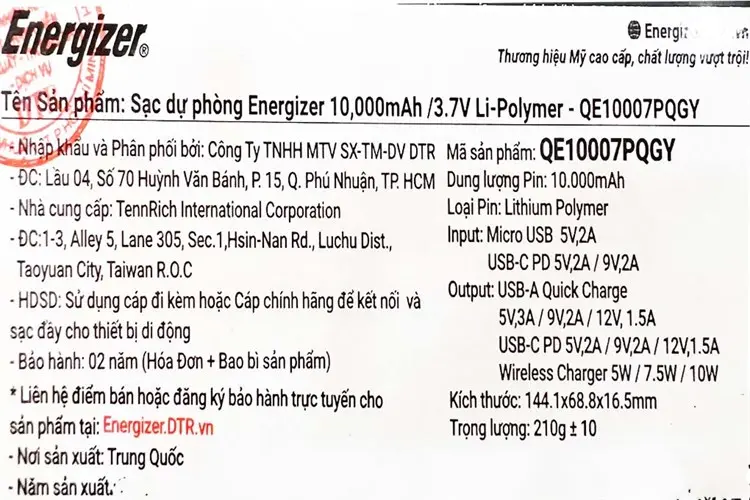 Thông số kỹ thuật Pin sạc dự phòng không dây Polymer 10.000 mAh Type C PD QC3.0 Energizer QE10007PQ