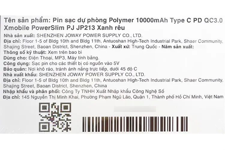 Thông số kỹ thuật Pin sạc dự phòng Polymer 10.000 mAh Type C PD QC3.0 18W Xmobile PowerSlim PJ JP213