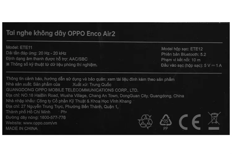 Thông số kỹ thuật Tai nghe Bluetooth True Wireless OPPO ENCO Air 2 ETE11