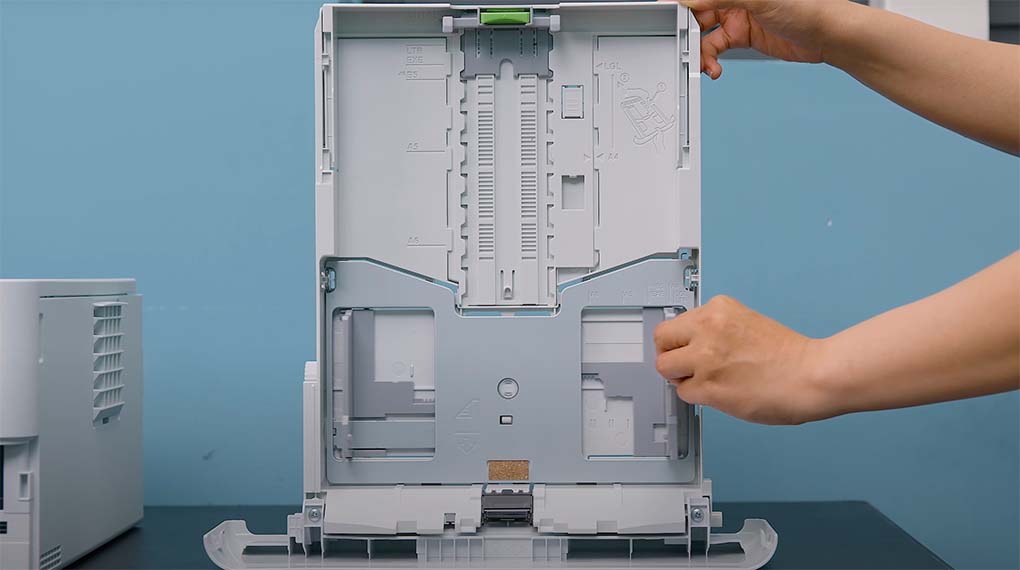 Hơn nữa, khay giấy cũng mang được tính linh hoạt hơn khi mình dễ dàng điều chỉnh được kích thước to nhỏ về chiều ngang, dọc của khay chứa, cho phép tương thích tốt hơn với nhiều loại giấy từ: B6, A5, A4, A6, B5 và có cả bao thư nữa.