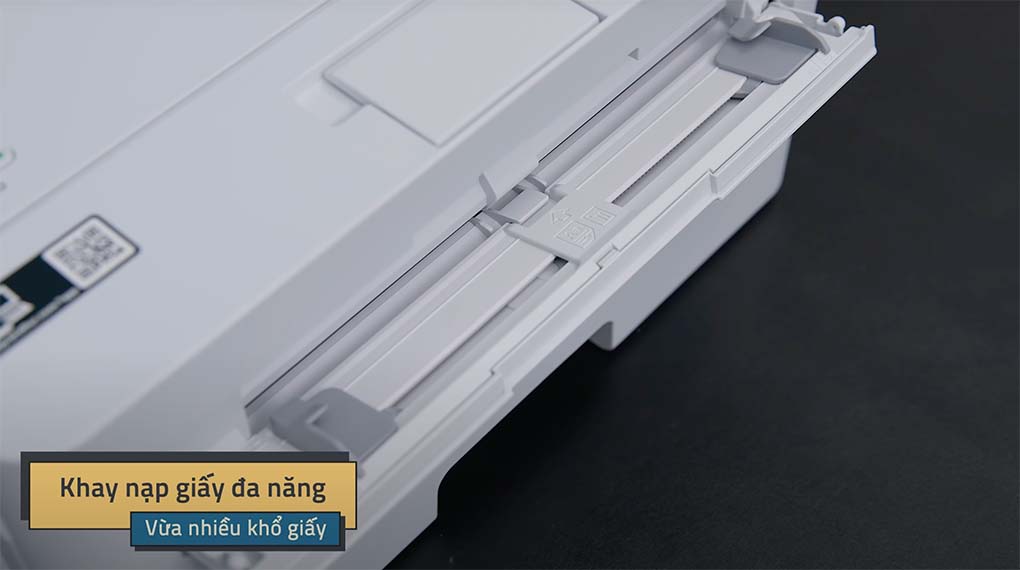 Về phần trên, chúng ta có một chiếc khay đa năng được thiết kế gọn gàng và nằm chìm hẳn vào thân máy, tính linh hoạt của khay cũng được đảm bảo tốt nhờ khả năng điều chỉnh được các kích cỡ tương thích với khổ giấy khi đưa vào.