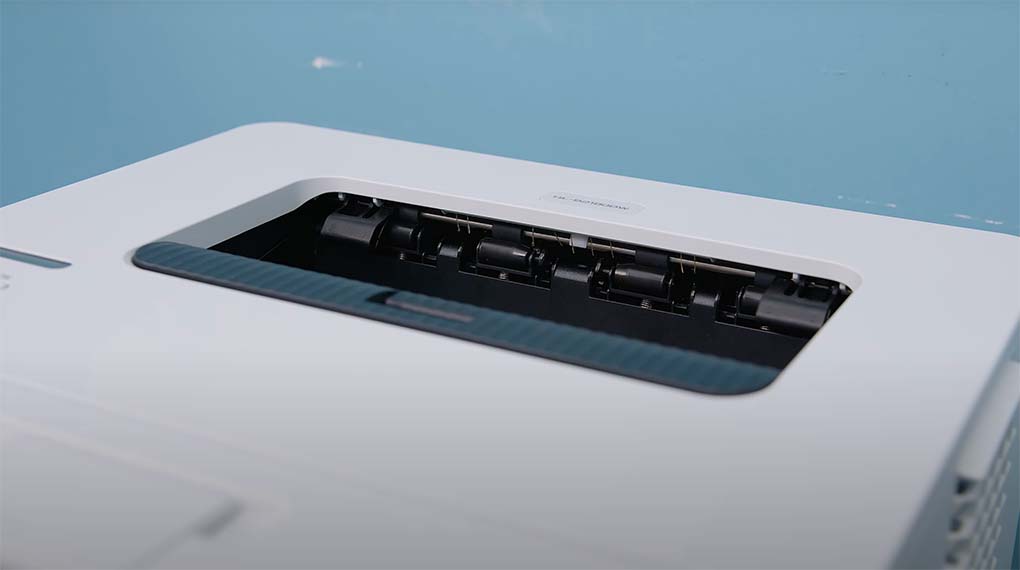 Hộp mực của máy được thiết kế nằm sau lớp nắp ở phía trên máy, các bạn cũng dễ dàng nhận thấy được các khớp mở.