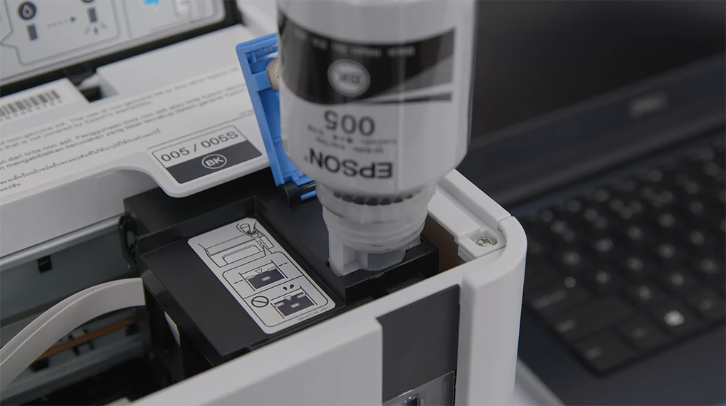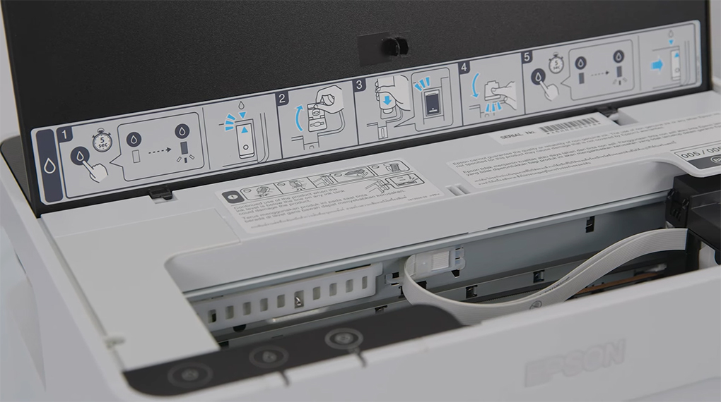 So các thao tác tháo lắp, thay hay rót mực cồng kềnh thì với máy in phun trắng đen Epson mình chỉ cần một vài bước đơn giản, tiết kiệm thời gian in ấn trong công việc hơn rất nhiều.