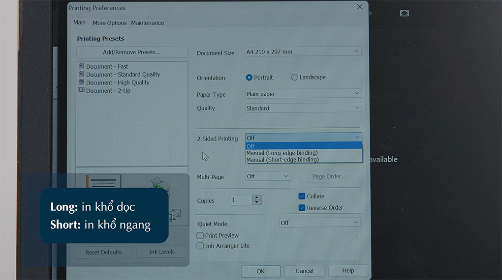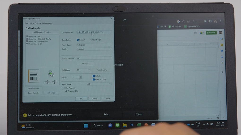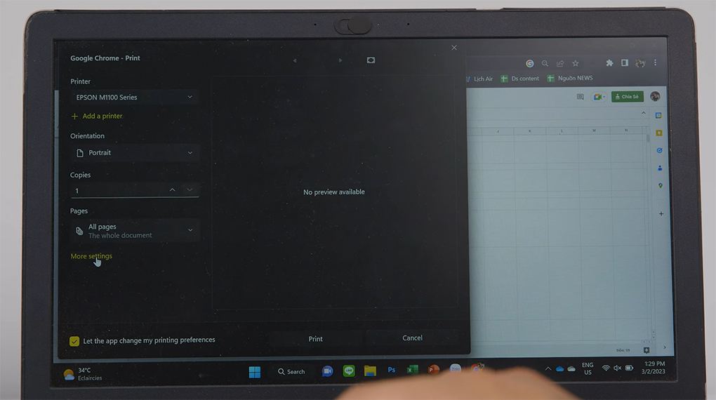 - Để tiến hành in ấn: Gọi hộp thoại của trình điều khiển Epson và chọn More settings. Bạn có thể thiết lập khổ giấy in, tỉ lệ in, số bản in, chế độ in (1 mặt hay 2 mặt).