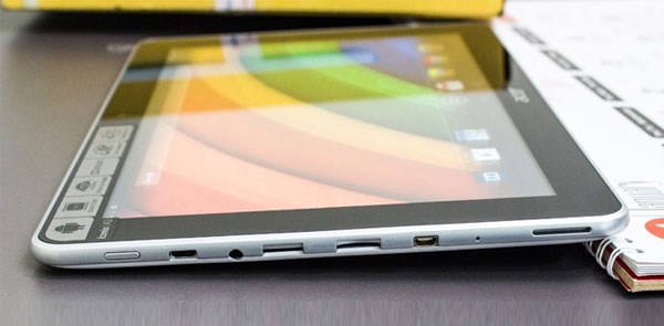 Cạnh phải là nút tăng giảm âm lượng. Nút nguồn và nút điều chỉnh âm có thiết kế hợp lý, dễ bấm. Khe thẻ nhớ không có nắp bảo vệ nên dễ bị bẩn và bám bụi. Micro-USB của Acer A3-A11 là một cổng đa năng, vừa cho chức năng chép file vừa là cổng sạc, lại có hỗ trợ OTG (On-The-Go) giúp kết nối với chuột và bàn phím như một chiếc máy tính.