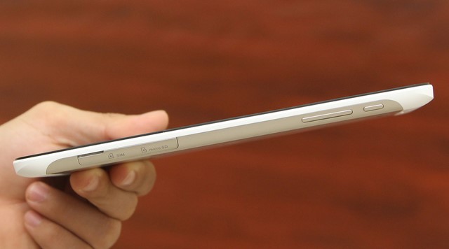Cạnh phải máy có phím nguồn, âm lượng và 2 khe cắm sim, thẻ nhớ