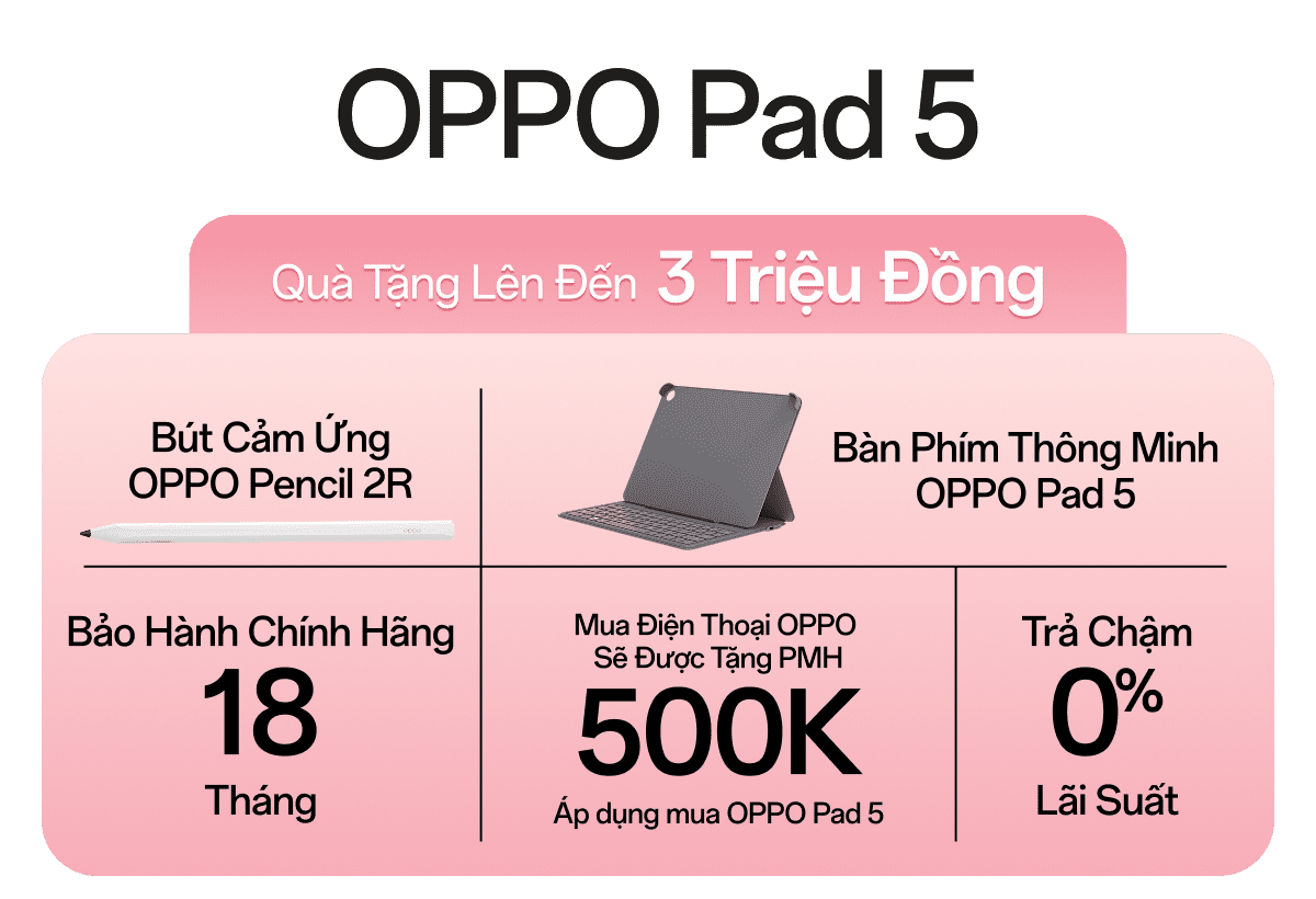 Hotsale chính thức mở bán OPPO Pad 5 mang đến cơ hội sở hữu tablet cao cấp với ưu đãi hấp dẫn. Khách hàng nhận ngay bộ quà tặng trị giá đến 3 triệu đồng, hỗ trợ trả chậm 0% lãi suất, giúp mua sắm dễ dàng hơn.