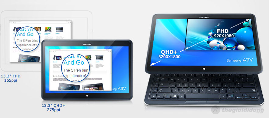 Màn hình của máy có kích cỡ 13.3 inch QHD+ siêu nét, độ phân giải 3200 x 1800 pixels, đạt mật độ điểm ảnh 275ppi, sánh ngang với hầu hết máy tính bảng cao cấp hiện có trên thị trường. Tương tự ATIV Tab 3, màn hình của Samsung ATIV Q cũng tương thích hoàn toàn với bút S Pen, phụ kiện được đặt trong ngăn riêng của máy.
