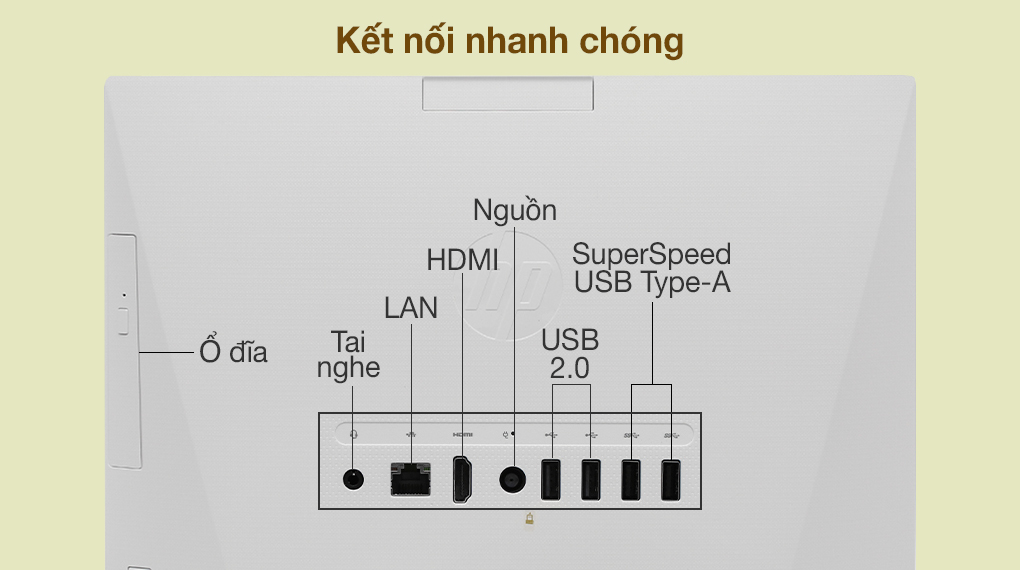 Máy tính All-in-one này được trang bị ở mặt sau 1 cổng LAN, 1 cổng HDMI, 2 cổng USB 2.0 và 2 cổng SuperSpeed USB Type-A cho tốc độ truyền tải dữ liệu nhanh chóng lên tới 480 Mbps và dễ dàng kết nối với các thiết bị ngoại vi.
