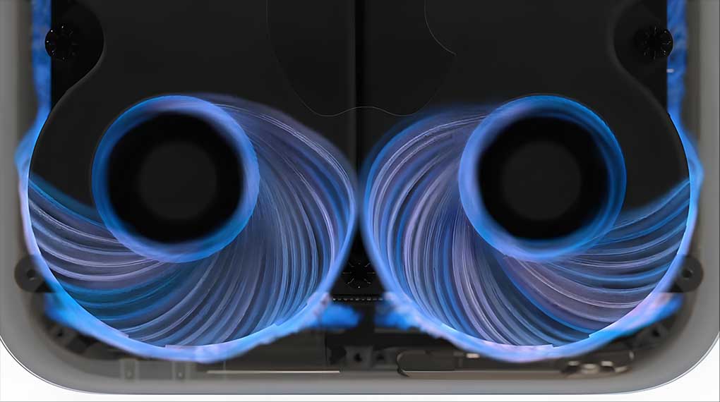 Ẩn mình bên trong vỏ máy Mac Studio nhỏ gọn là một hệ thống tản nhiệt đột phá, với các quạt gió lớn được chế tạo bằng vật liệu tiên tiến, giúp giảm thiểu tiếng ồn và rung động. Kết hợp cùng kênh dẫn khí được thiết kế tỉ mỉ giúp luân chuyển không khí hiệu quả, đảm bảo nhiệt độ luôn ở mức ổn định để duy trì hiệu suất hoạt động trong thời gian dài.