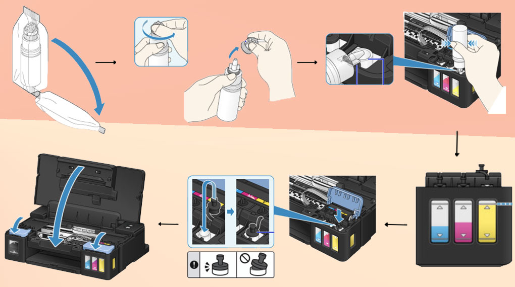 Bước 3: Ở bộ phận hộp mực, bạn tìm kiếm ô có ký hiệu chữ Y (màu vàng) và lồng vòi phun vào đầu ô nạp mực đó, dựng thẳng đứng và bóp nhẹ lọ để mực chảy vào hộp.