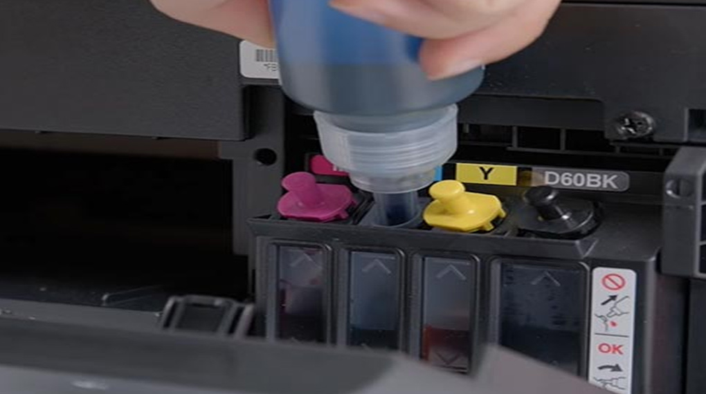 Bước 4: Quan sát lượng mực in đã bơm vào máy từ bên ngoài và dừng khi đã vừa đủ lượng mực in.