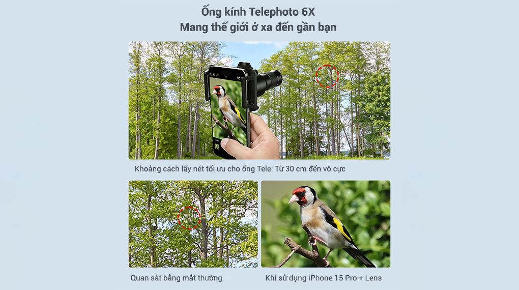 Trọng tâm của bộ ống kính tele này là ống tele zoom 6X, cho phép phóng đại hình ảnh hoàn toàn bằng quang học thay vì dựa vào thuật toán zoom kỹ thuật số. Khi gắn lên camera chính của điện thoại, ống tele giúp mở rộng tiêu cự, mang lại góc nhìn hẹp hơn, chủ thể được làm nổi bật rõ ràng và hậu cảnh được nén lại tự nhiên.