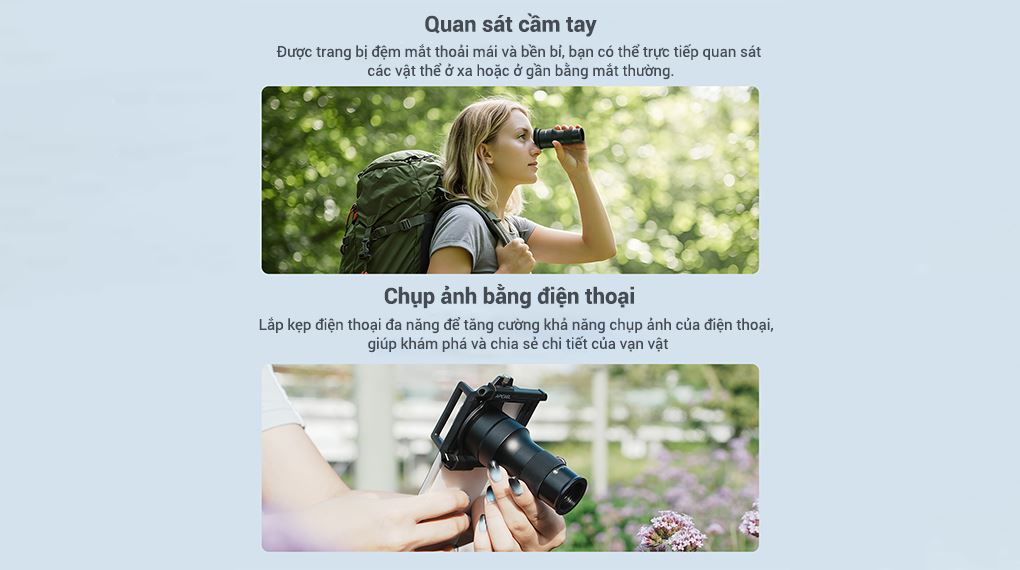 Trải nghiệm quan sát mang lại hình ảnh rõ ràng, dễ chịu cho mắt và phù hợp cho các hoạt động ngoài trời như du lịch, dã ngoại, quan sát thiên nhiên hoặc sự kiện. Thiết kế nhỏ gọn giúp người dùng dễ dàng mang theo và sử dụng linh hoạt trong nhiều tình huống khác nhau.