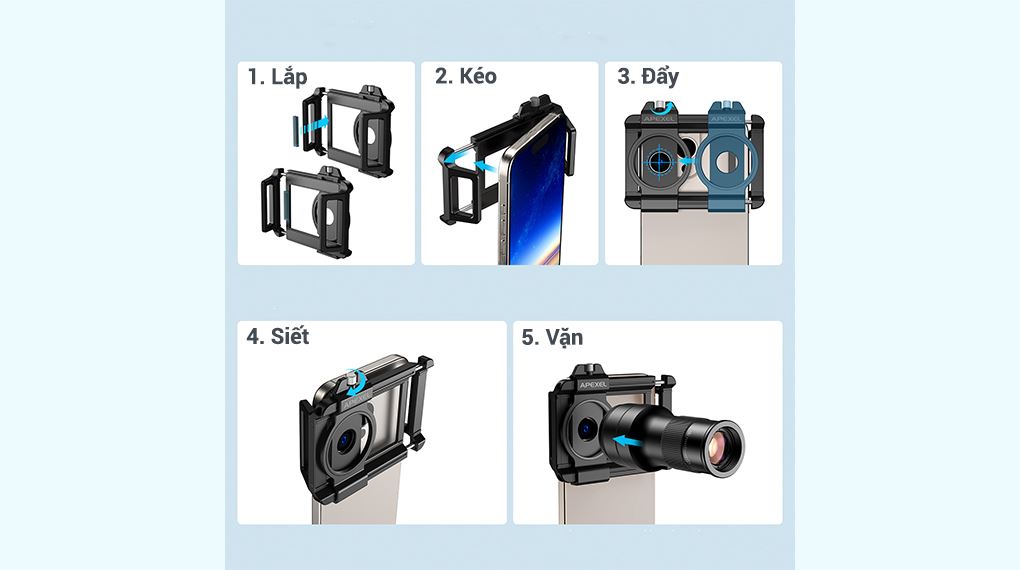 Sau khi điện thoại đã được giữ ổn định, người dùng điều chỉnh thanh trượt trên kẹp để căn chỉnh chính xác tâm ống kính Apexel trùng khớp với camera chính của điện thoại, đảm bảo hình ảnh không bị lệch hoặc viền tối.