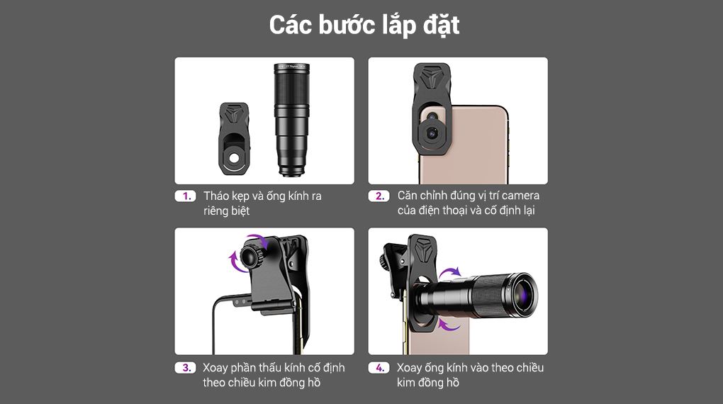 Bước 2, vặn ống kính mong muốn như tele 22X, góc rộng, mắt cá hoặc macro vào ngàm ren tiêu chuẩn trên kẹp theo chiều kim đồng hồ cho đến khi cố định chắc chắn.