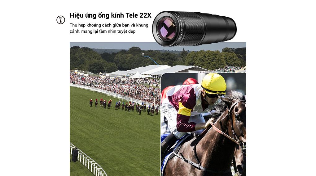 Trung tâm của bộ ống kính tele này là ống tele zoom quang học 22X, cho phép phóng đại hình ảnh ở khoảng cách rất xa mà không phụ thuộc vào zoom kỹ thuật số của điện thoại. Khi gắn lên camera chính, ống tele giúp mở rộng tiêu cự đáng kể, làm nổi bật chủ thể ở xa, đồng thời nén phối cảnh một cách tự nhiên hơn.