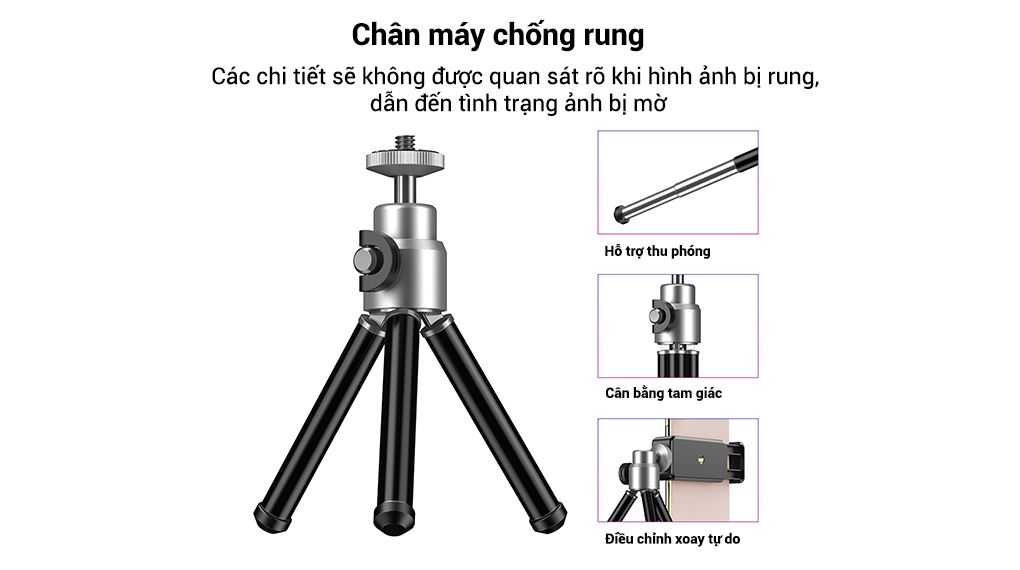 Khác với nhiều bộ ống kính chỉ tập trung vào phần quang học, Ống kính Apexel APL-22X105-4IN1 được trang bị thêm chân máy chống rung, giúp cải thiện đáng kể độ ổn định khi sử dụng ống tele zoom lớn. Chân máy có cấu trúc cân bằng tam giác, hỗ trợ cố định điện thoại chắc chắn hơn, hạn chế rung lắc - yếu tố thường gây mờ hình khi chụp xa hoặc quay video.