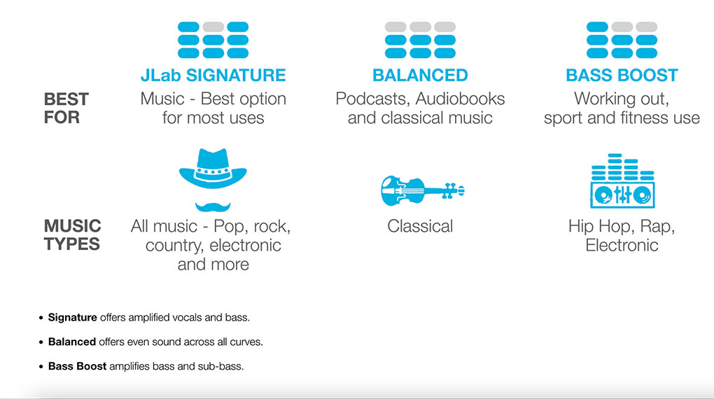 • Chế độ Signature: chất âm được thể hiện theo dạng âm chữ V sẽ nâng dải bass cao hơn một chút so với dải mid và treble, phù hợp cho các bạn nghe các dòng nhạc EDM có bass nhẹ.
