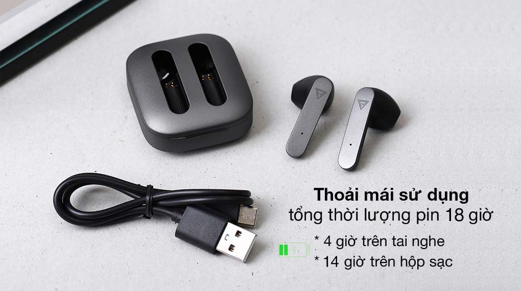 Tai nghe có 4 giờ sử dụng và dùng kèm hộp sạc nâng tổng thời gian sử dụng lên tới 18 giờ, thoải mái để bạn sử dụng theo nhu cầu suốt ngày dài mà không lo lắng tình huống cạn nguồn, rất thích hợp mang theo cho các chuyến du lịch, dã ngoại…
