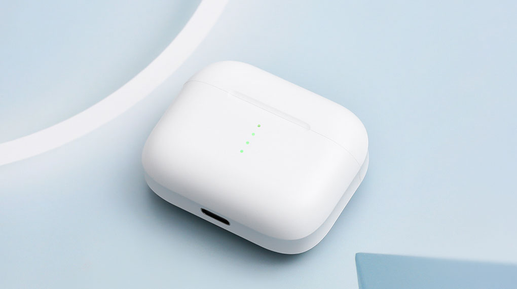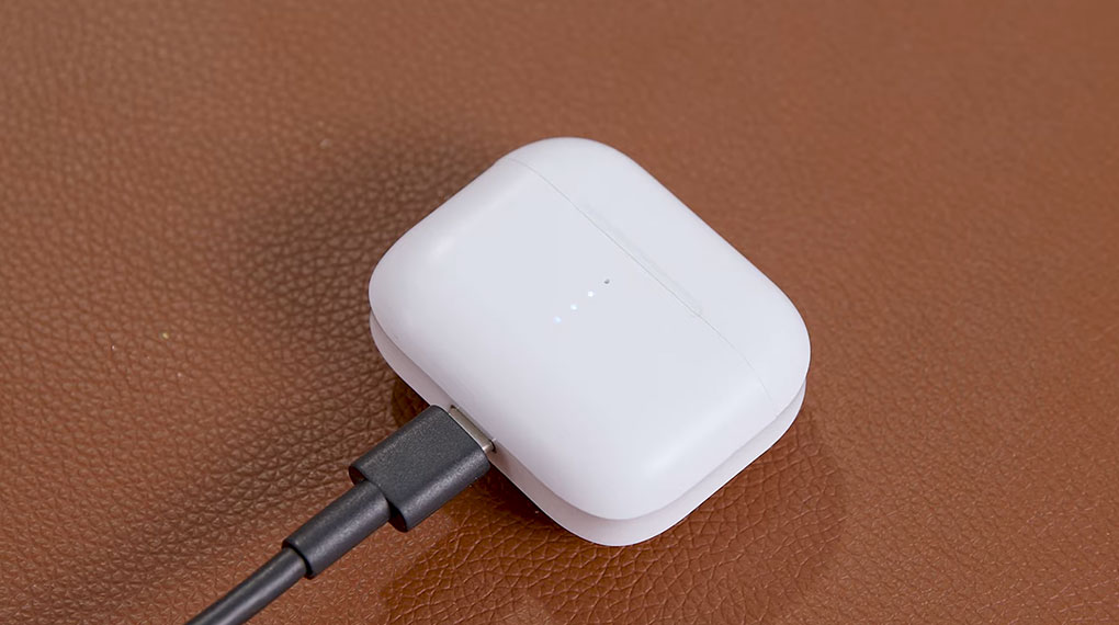 Mặt trước của hộp tai nghe được trang bị một dãy gồm 4 đèn LED. Khi mình mở nắp, đèn báo pin hiện tại của hộp sạc luôn sáng trong 8 giây rồi tắt. Lúc mình đóng nắp hộp sạc mà không có tai nghe bên trong thì đèn sẽ sáng trong 3 giây rồi tắt. Còn khi đóng nắp hộp sạc mà có tai nghe thì đèn báo hiệu sẽ nhấp nháy 6 lần rồi tắt. Khi hộp sạc hết pin thì chiếc đèn LED cuối cùng sẽ nháy trong 35 giây để báo hiệu.