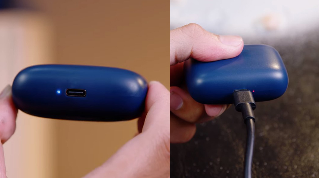 Phần mặt đáy là nơi chứa cổng sạc USB Type-C và đèn LED báo hiệu tình trạng pin. Với đèn trắng là còn pin, khi sắp hết pin đèn trắng sẽ nhấp nháy, lúc sạc pin thì sẽ nháy đỏ, sau khi đầy đèn sẽ sáng đỏ. Đồng thời, khi bạn sạc tai nghe trong hộp sạc, đèn sẽ báo sáng và lúc đầy pin sẽ tắt đèn.