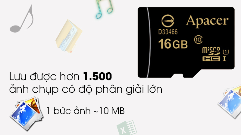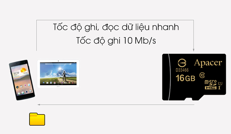 * Tốc độ ghi dữ liệu (tối thiểu) 10 MB/s: chép 1 file dữ liệu nặng 1 GB vào thẻ nhớ trong 2 phút.
