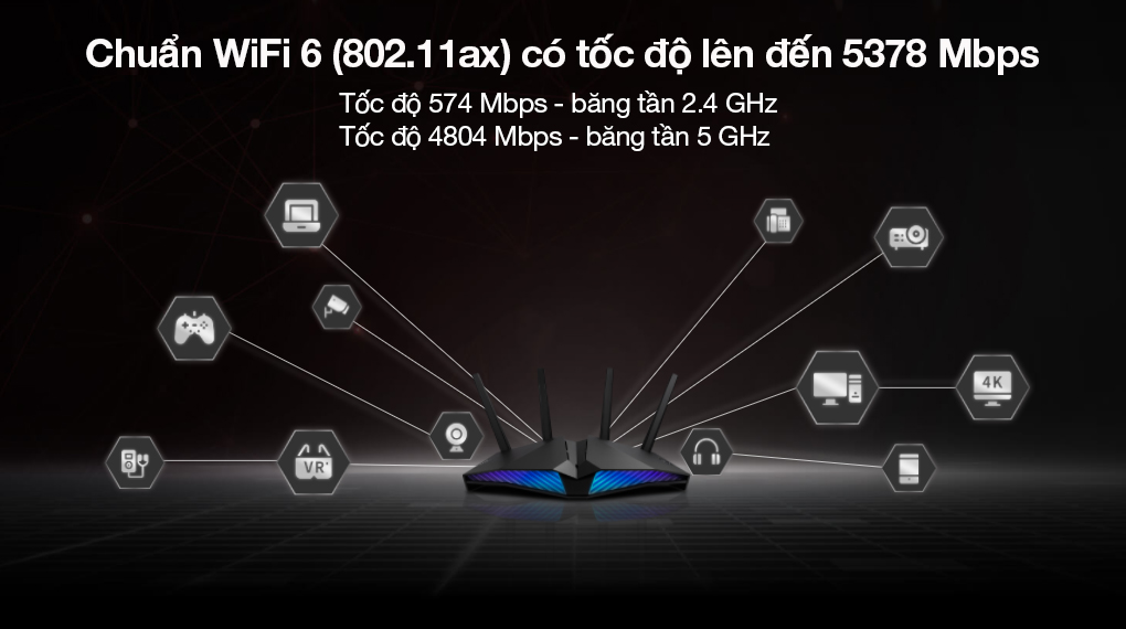 Tốc độ WiFi trên băng tần 2.4 Hz cho 574 Mbps, băng tần 5 GHz cho tốc độ 4804 Mbps, phục vụ tốt từ nhu cầu duyệt web, kiểm tra email đến chơi game trực tuyến. Tích hợp 4 ăng-ten ngoài bắt sóng ổn định, cung cấp kết nối cho 60 thiết bị đồng thời trong bán kính phủ sóng khoảng 22 m.