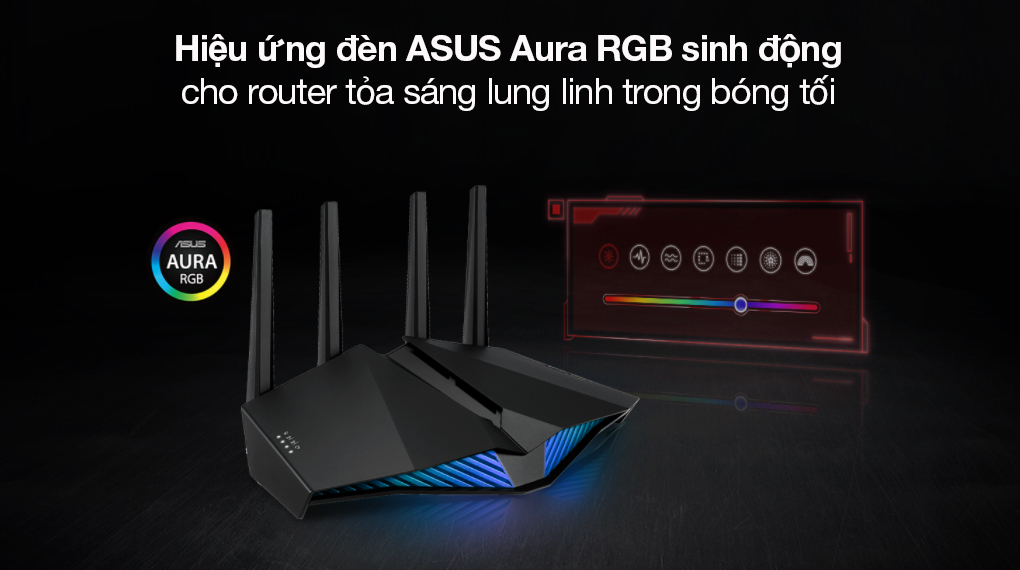 Bộ Phát Sóng Wifi Router Chuẩn Wifi 6 AX5400 Asus RT-AX82U Gigabit đen có tính năng ASUS Aura RGB thiết lập các chế độ đa sắc với hàng trăm màu sinh động, cho bạn lựa chọn hiệu ứng, tùy chỉnh theo từng chế độ để chọn ra kiểu ánh sáng phù hợp với sở thích của mình nhất.