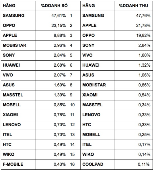 Nếu đối chiếu thị phần các hãng smartphone được bán ra tại Thế Giới Di Động với dữ liệu trên của GfK thì kết quả khá tương đồng với nhau.