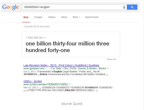 Khó khăn với cách phát âm của một dãy số dài, chỉ cần gõ dãy số cần đọc + “=english” vào ô tìm kiếm và “Enter”.