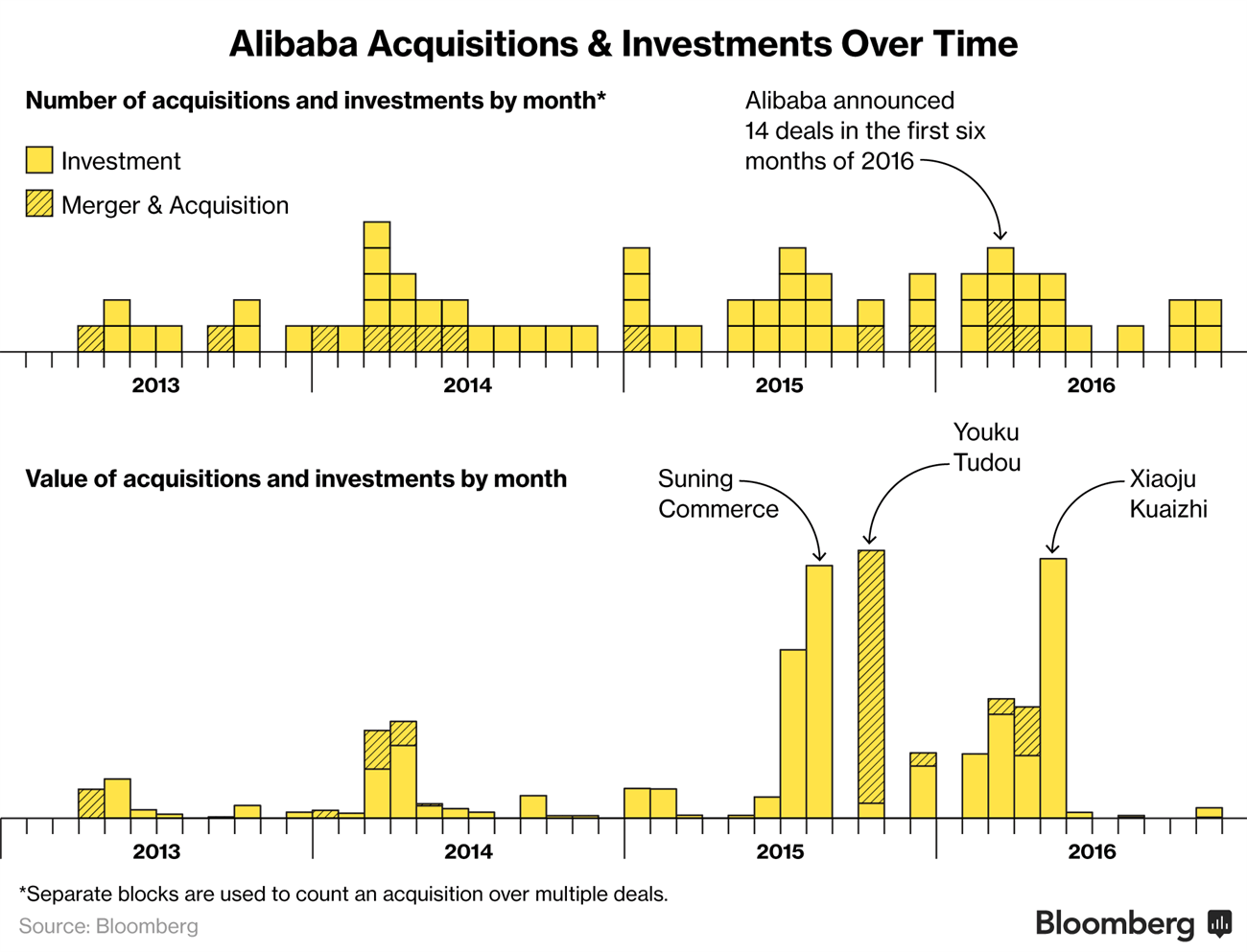 Bloomberg cho biết, hiện Alibaba đang sử dụng chiến thuật "thâu tóm" để hoàn thiện hệ sinh thái của họ. Nói trắng ra, họ thâu tóm các nhà sản xuất nội dung tin tức và video, các dịch vụ offline và các công ty trên toàn cầu với mục tiêu đánh chiếm thị trường thương mại điện tử bên ngoài Trung Quốc.