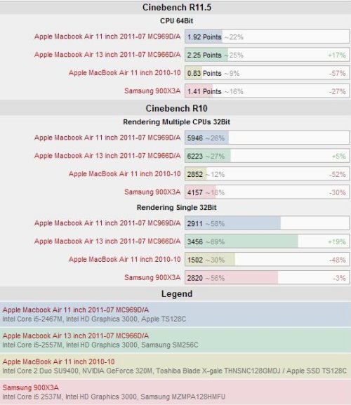 Laptop của Apple cũng có khả năng thể hiện sức mạnh xử lý mạnh mẽ của mình khi được sử dụng với Mac OS X. Khi so sánh với vi xử lý Core Duo 2, Core i5 nhanh hơn đáng kể, thậm chí là còn nhanh hơn cả Core 2 Duo P8600 2.4 GHz được sử dụng trong MacBook Pro 13 phiên bản 2010 dù có xung nhịp thấp hơn.