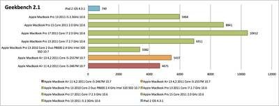 Đánh giá hiệu suất toàn bộ hệ thống với PCMark 7, điểm số của MacBook Air 11 inch thuộc vào hàng top với 3289 điểm, chỉ kém hơn 8% so với MacBook Air 13 inch.