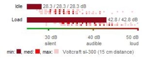 Tuy có sự khác biệt về kích thước và bộ xử lý chậm hơn so với người anh em 13 inch nhưng MacBook Air 11 inch vẫn có một điểm tương đồng đó là độ ồn thấp. Ngay cả trong khi thử nghiệm với trình benchmark Cinebench R10, máy vẫn tỏ ra khá yên tĩnh, các quạt tản nhiệt chỉ hoạt động ở mức 2000 vòng/phút. Chỉ khi chạy các tác vụ nặng như xem và chỉnh sửa video HD trong thời gian dài thì độ ồn của MacBook Air 11 inch mới tăng cao nhưng nhìn chung thì máy có độ ồn khá thấp khi so sánh với các laptop khác.