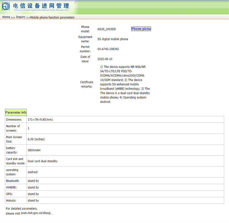 Dữ liệu từ TENAA đề cập đến thông số kỹ thuật của Asus I003DD, tên mã này thuộc về ASUS ROG Phone 3. Cụ thể hơn, ASUS ROG Phone 3 sẽ trang bị màn hình kích thước 6.59 inch, tích hợp viên pin dung lượng 5.800 mAh và hỗ trợ mạng 5G băng tần kép SA / NSA.