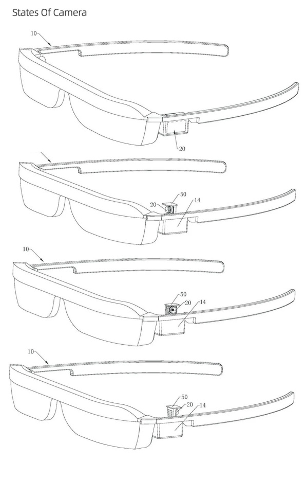 Các bản phác thảo bên dưới cho thấy kính AR của Huawei được tích hợp camera selfie dạng pop-up ở bên gọng trái và có thể xoay để chụp ảnh bên trái hoặc phía sau người đeo.