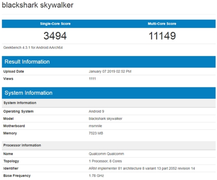 GeekBench cho thấy smartphone chuyên game Black Shark mới dùng chip Qualcomm Snapdragon 855 kết hợp với RAM 8 GB, chạy Android 9 và đạt 3.494 điểm ở bài kiểm tra đơn nhân, còn đa nhân là 11.149 điểm.