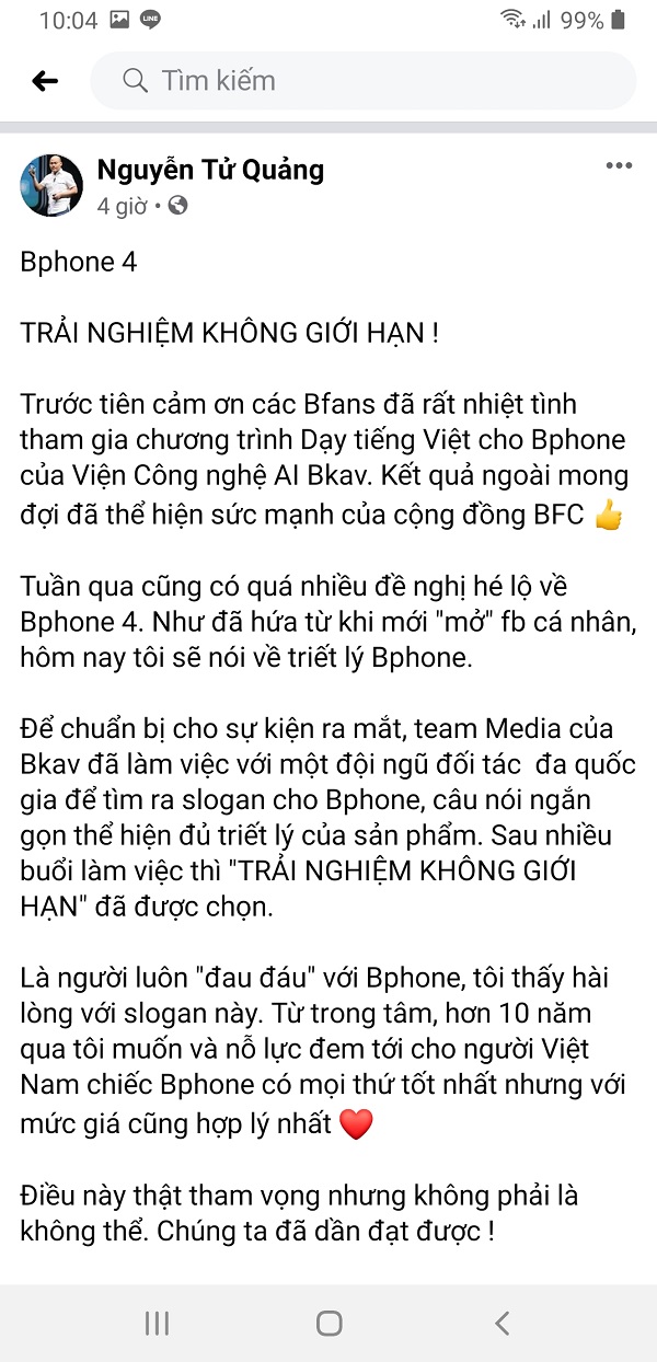 Hồi cuối năm 2019, CEO Bkav, ông Nguyễn Tử Quảng chia sẻ trên trang Facebook cá nhân rằng Bphone 4 sẽ tiên phong trong lĩnh vực Nhiếp ảnh điện toán. Hôm nay ông bật mí thêm rằng slogan của Bphone 4 chính là Trải nghiệm không giới hạn.