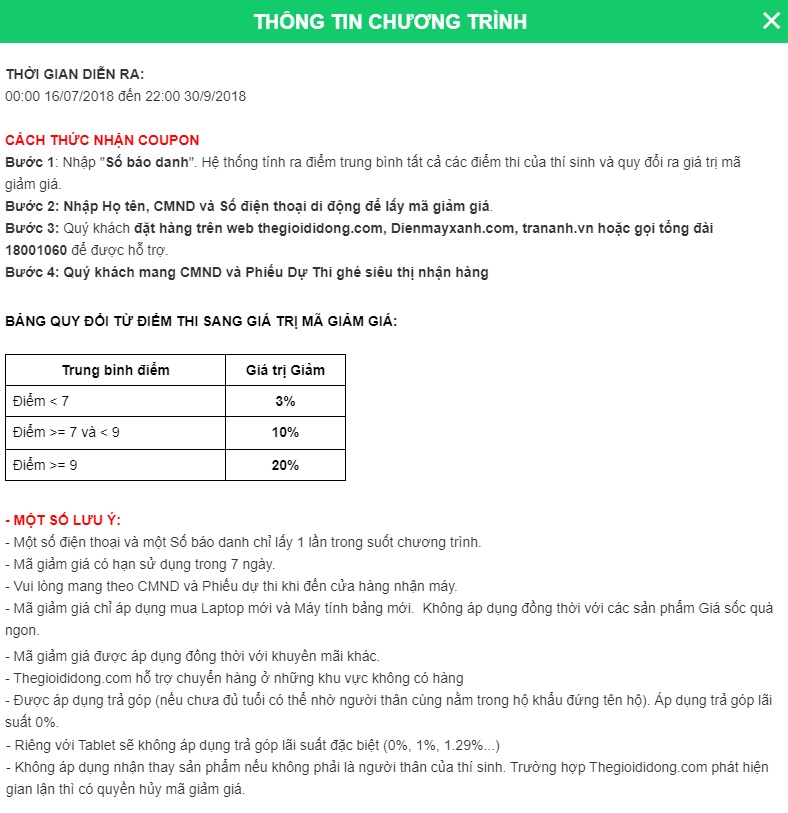 Các bạn học sinh trung học phổ thông vừa thi tốt nghiệp có thể dùng chính điểm thi của mình để đổi lấy mã giảm giá mua laptop - tablet và cơ hội trúng học bổng. Điểm càng cao, giá giảm càng nhiều (có điểm là có giảm, cao nhất lên đến 20%).