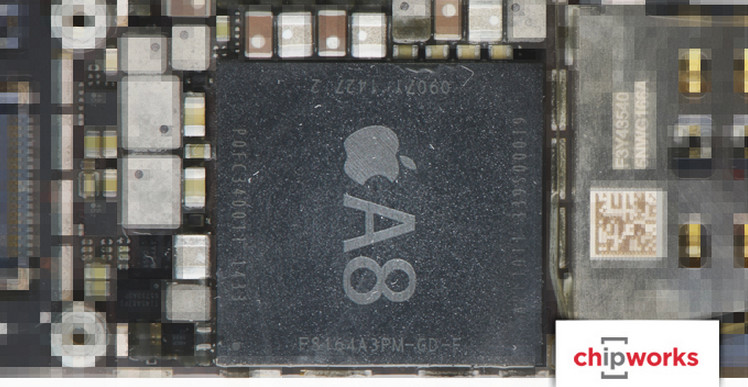 Một số chi tiết khá lạ xuất hiện khi bạn nhìn vào bên ngoài, hậu tố APU trên A8 chuyển sang tên gọi khác, từ “98” (Apple A5 là APL0498) chuyển sang hậu tố “11” (Apple A8 được đánh dấu là APL1011).