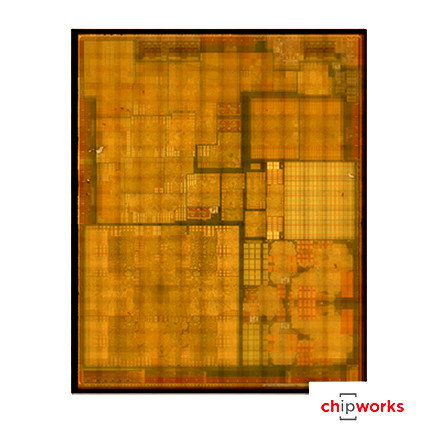 Mặt cắt ngang của A8 cho thấy linh kiện này được làm từ vật liệu kim loại với 10 lớp ngăn xếp. Điều thú vị là Apple dường như tái sắp xếp theo kiểu cũ với bộ vi xử lý dual-core Cyclone ở góc dưới cùng bên phải, trong khi cụm GPU ở phần dưới cùng bên trái.