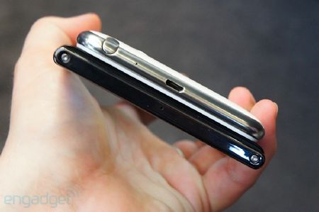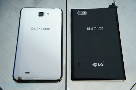 Galaxy Note (trái) so dáng cùng Optimus Vu. Galaxy Note có thiết kế dài và hẹp hơn so với đối thủ.