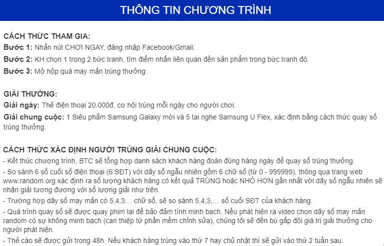 - Trường hợp khách hàng trúng giải siêu phẩm Samsung Galaxy sẽ đóng thuế thu nhập cá nhân 10% của số tiền trên 10 triệu đồng.