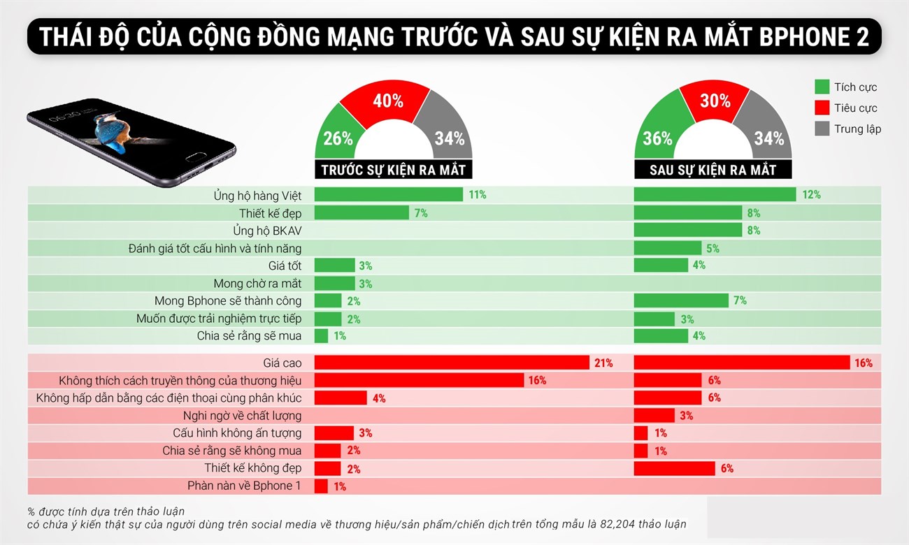 Trước sự kiện, lượng thảo luận tiêu cực hướng về sản phẩm, thương hiệu lên đến 40%. Phần lớn cư dân mạng vẫn còn bị ảnh hưởng từ ấn tượng không tốt về Bphone 2015 nên không đặt nhiều kỳ vọng vào Bphone năm nay.